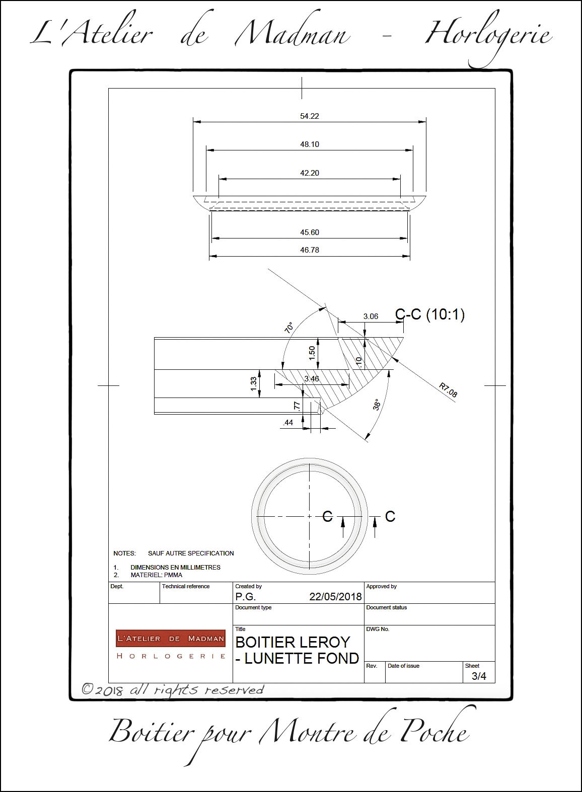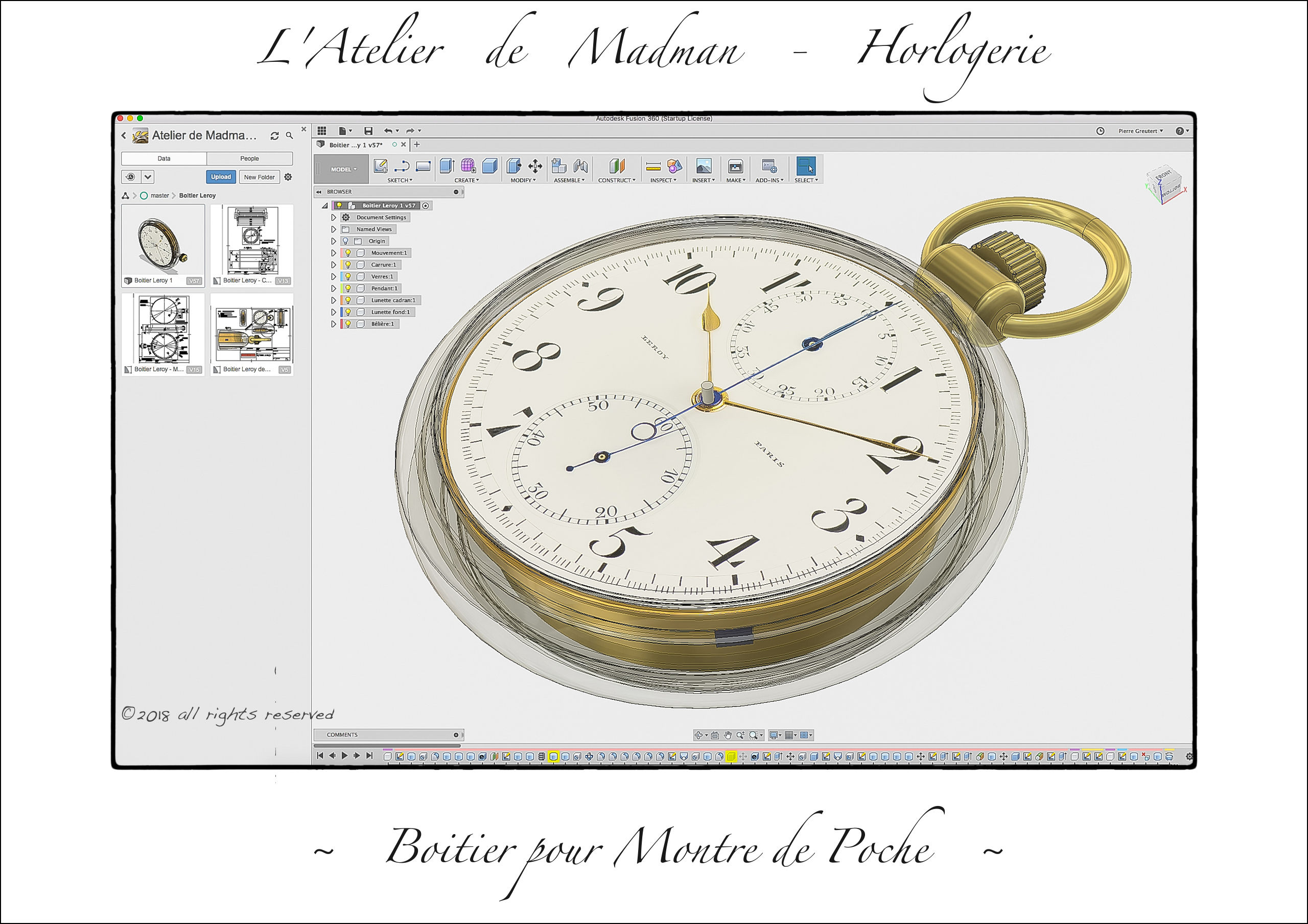 Conception et fabrication d’un boitier pour montre de gousset. Première étape : dessin de la pièce, à l’aide de l’excellent logiciel DAO Autodesk Fusion360.