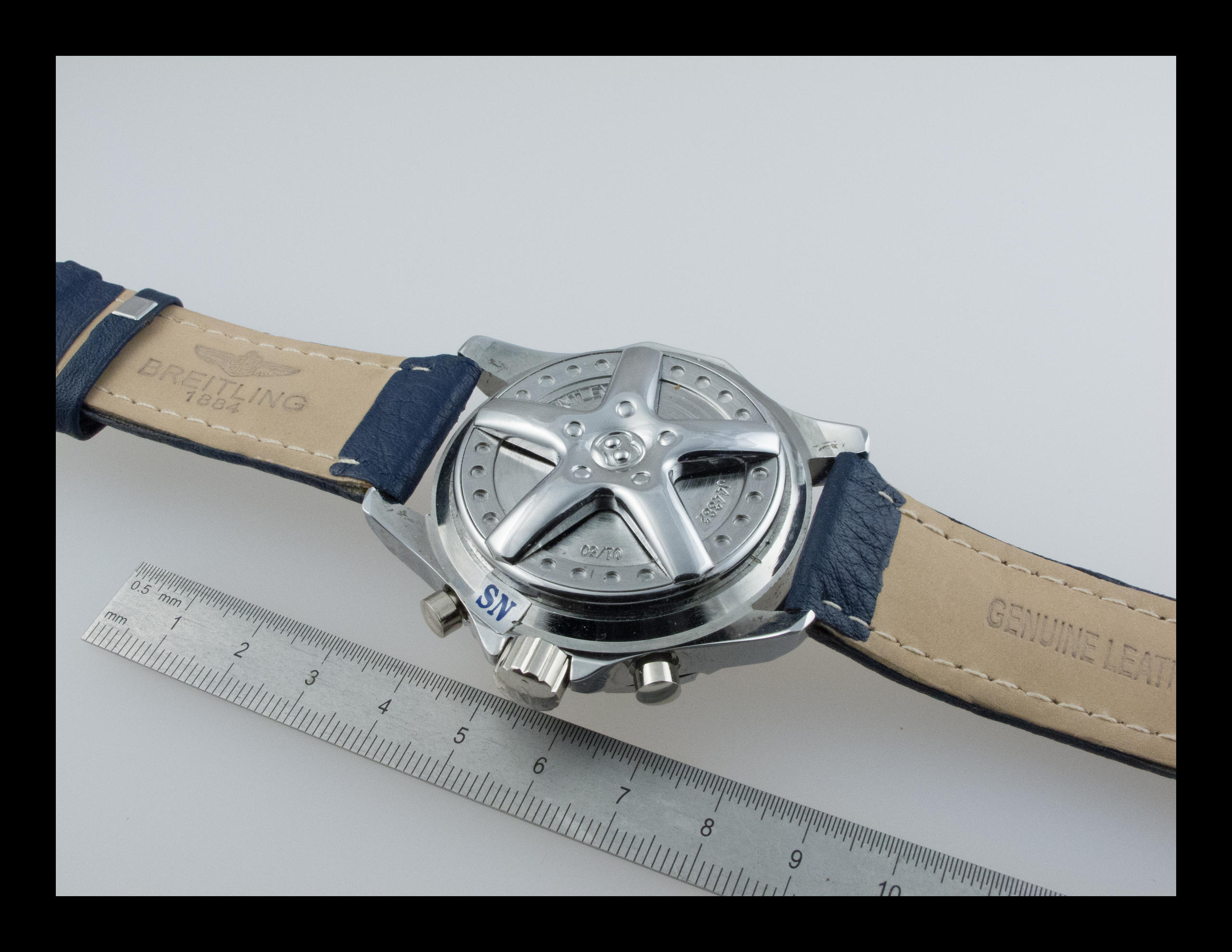Le fond présente une belle jante de Bentley à 5 branches, ajourée sportivement dans le pur respect de la tradition haute horlogerie.