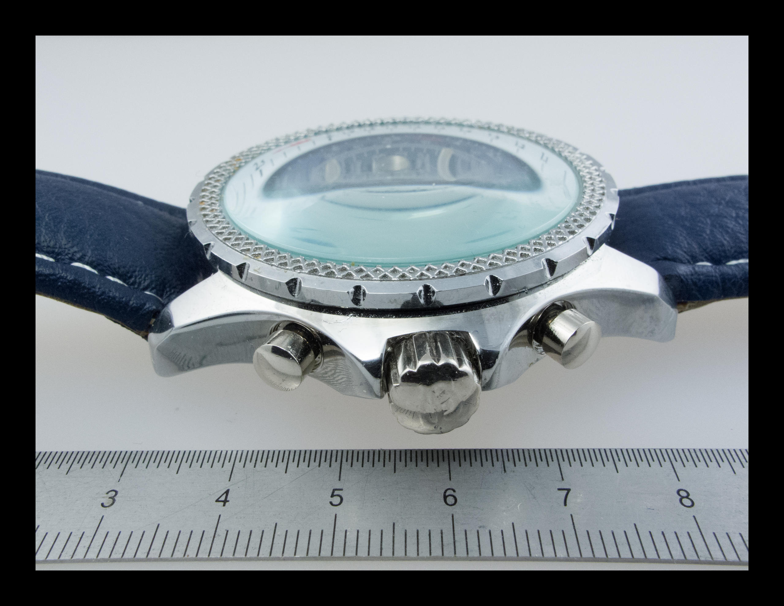 Heureusement le verre saphir n’est pas rayé et la couronne aborde fièrement le logo Breitling. Un peu usé il faut le dire, mais c’est surement dû à la patine.