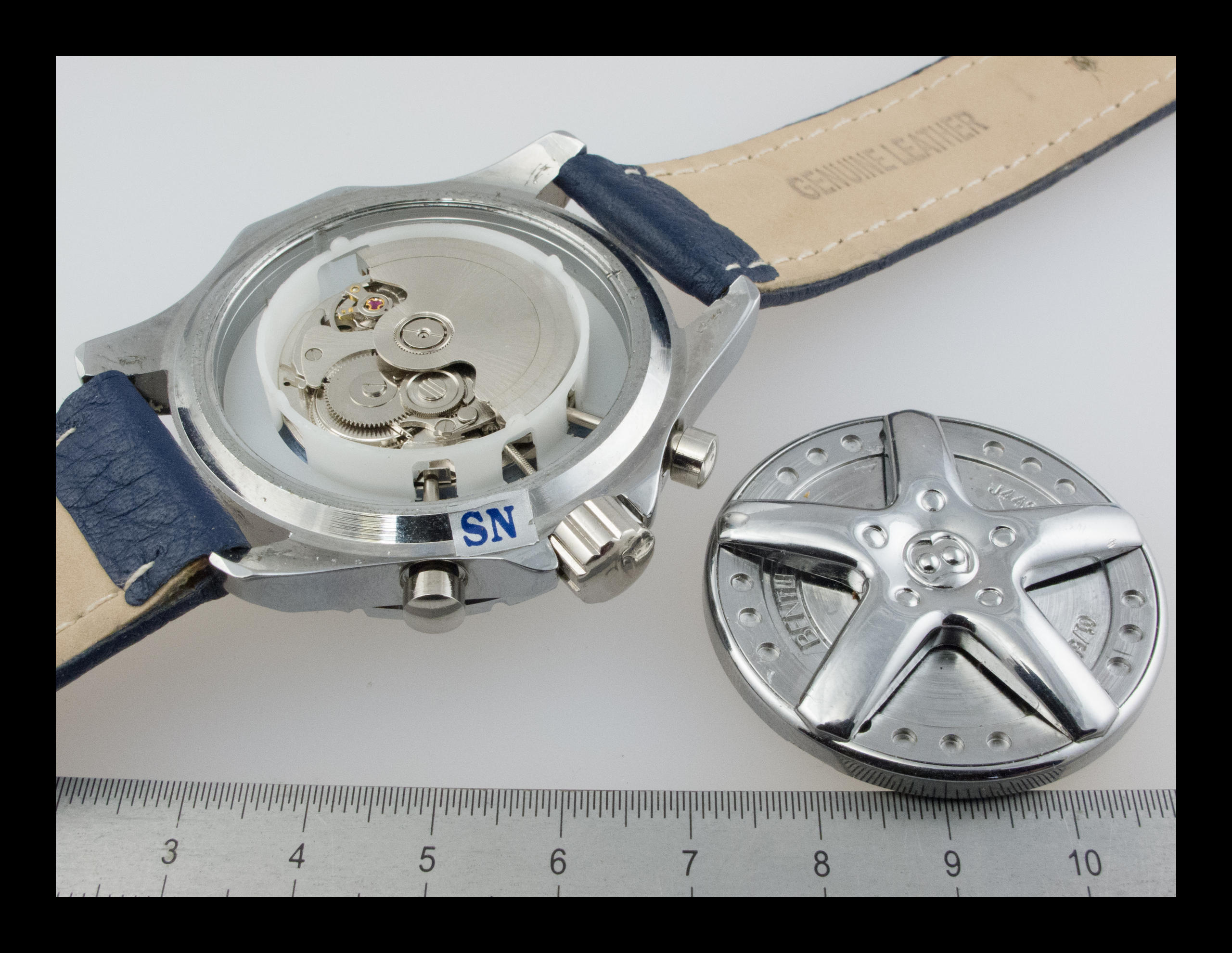 Le fond sort après un « dévissage » approprié (il n’y a pas de pas de vis). On aperçoit immédiatement comment le mouvement est maintenu par l’intermédiaire d’une bague en plastique véritable. Il y a même un sticker d’authenticité garantissant l’unicité de cette montre.