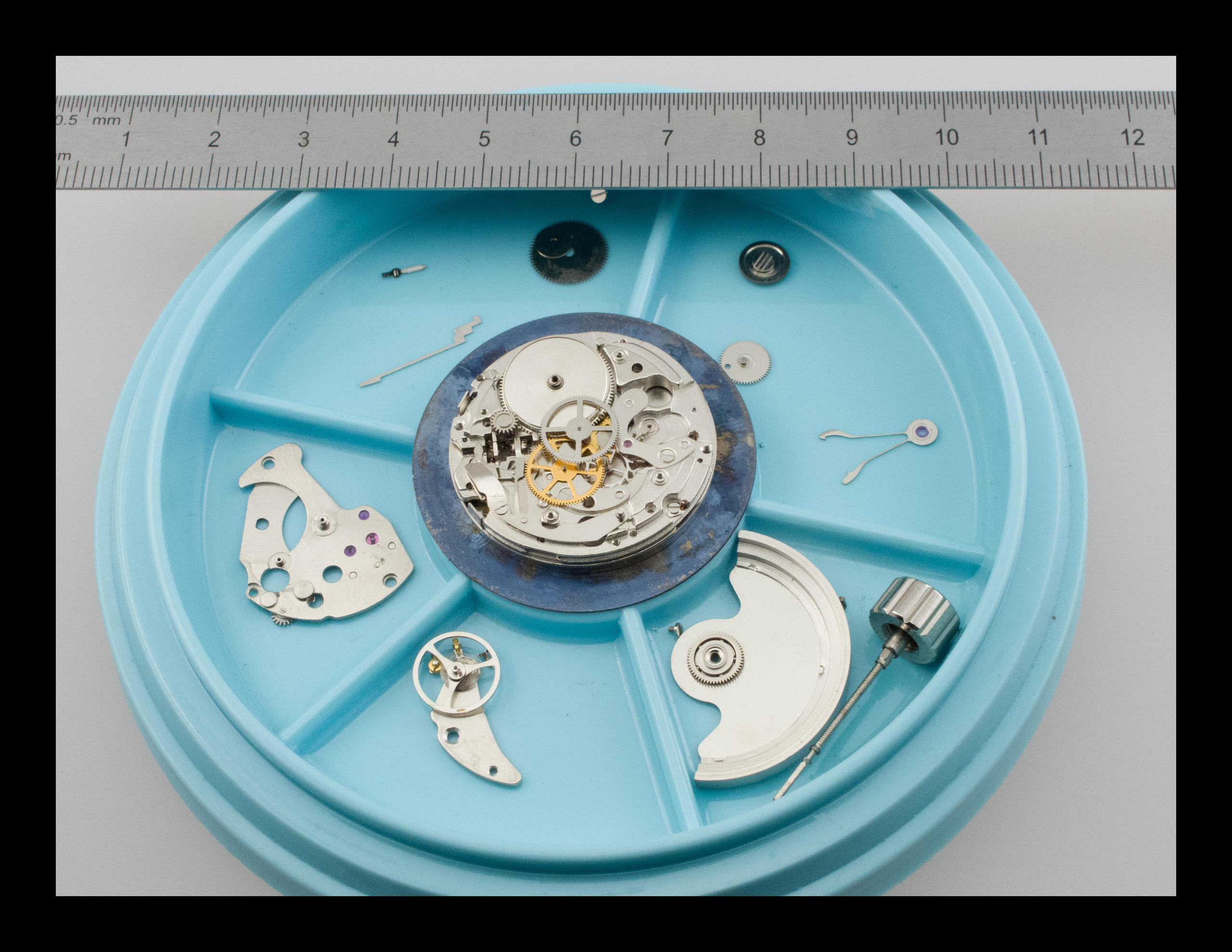 Il manque une aiguille. Un index fait défaut. La lunette tourne sans crans. Le remontage ne produit rien. La mise à l’heure ne tourne que l’aiguille des heures. Au passage elle pousse l’aiguille des minutes. Le STOP du chrono fait avancer l’année. Le START ne fait rien… Hmmm, du boulot en perspective !