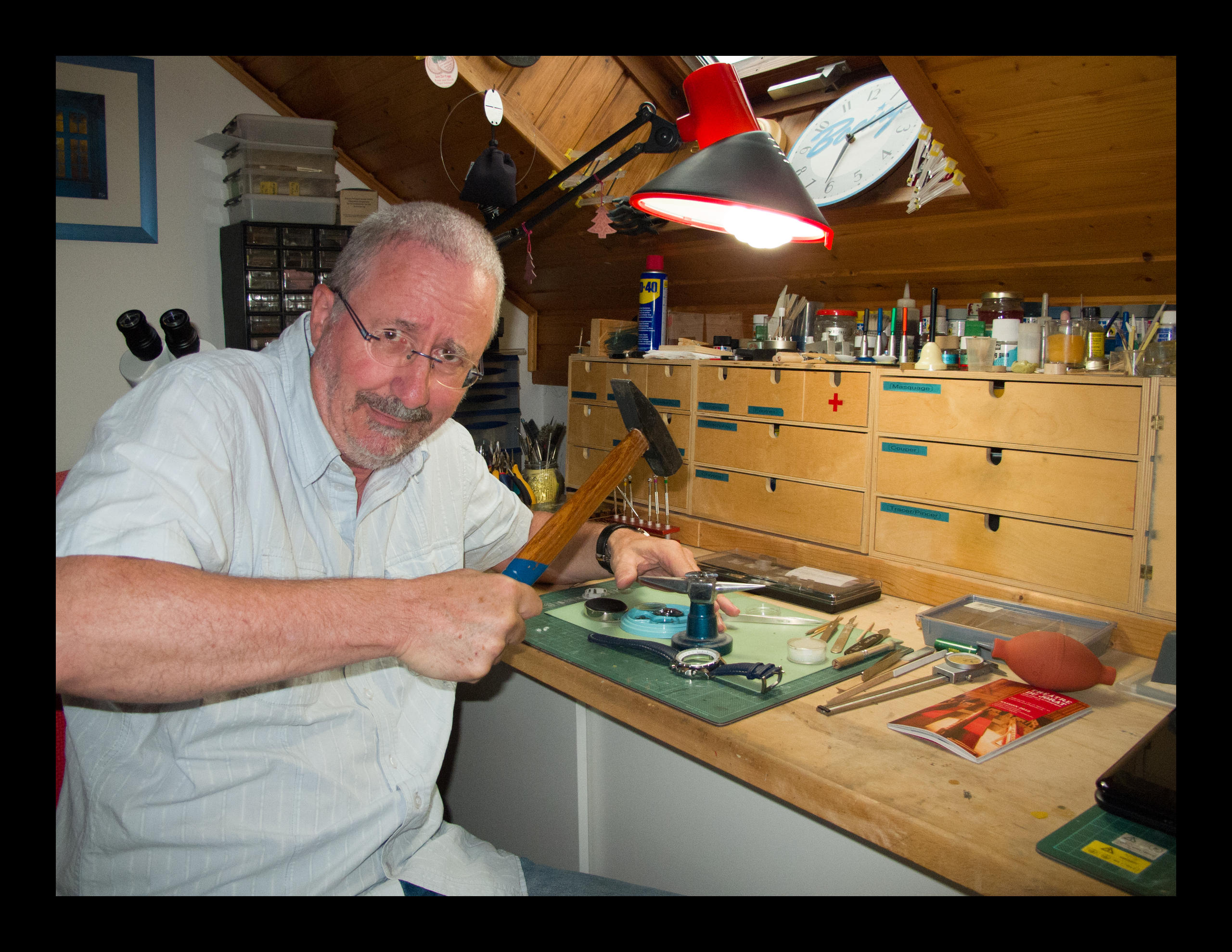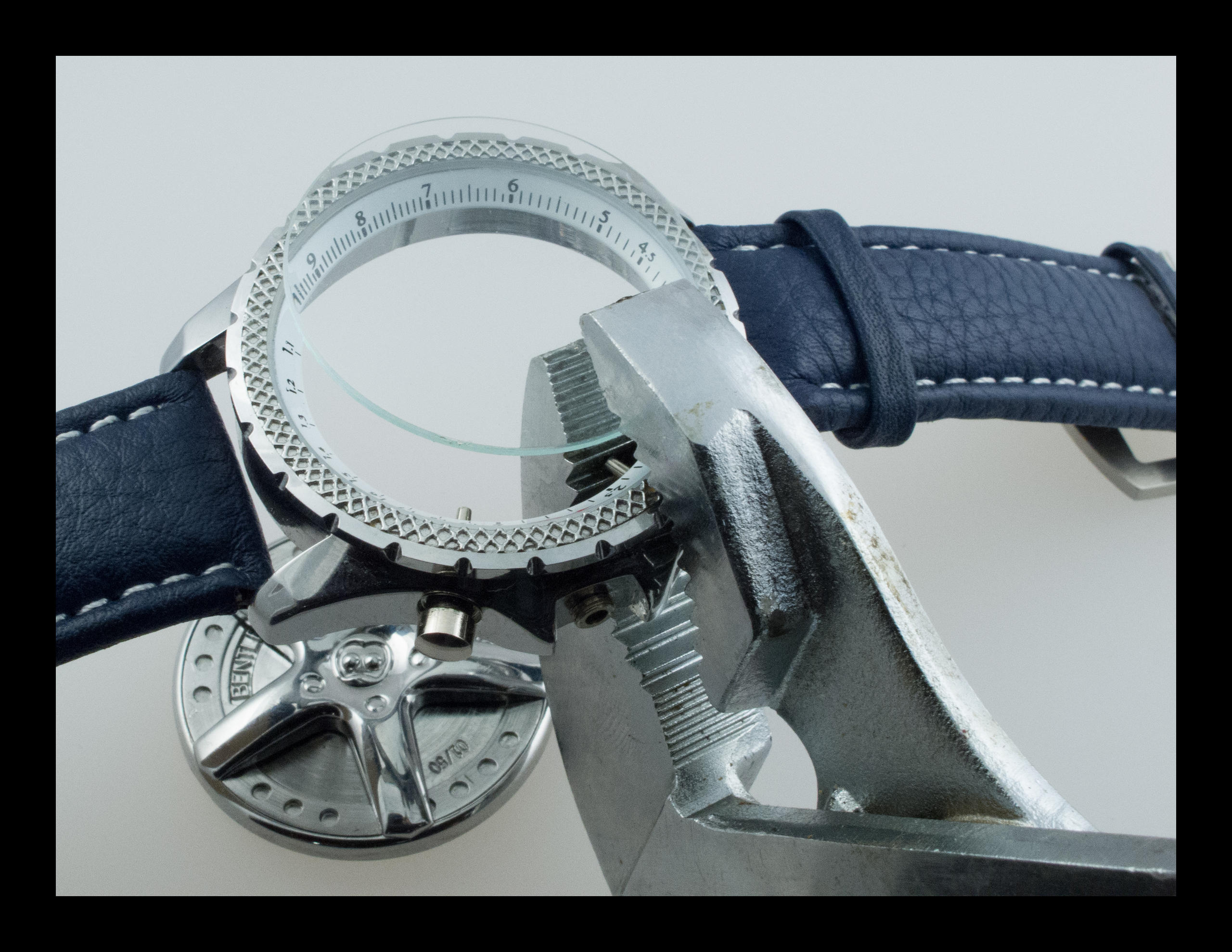 Le verre est plus difficile à rentrer. Aucun tasseau de potence n’est adapté à cette carrure hors normes. Je dois recourir à un instrument d’exception pour l’horloger, une « water plomp tang » spécialement importée de Hollande.