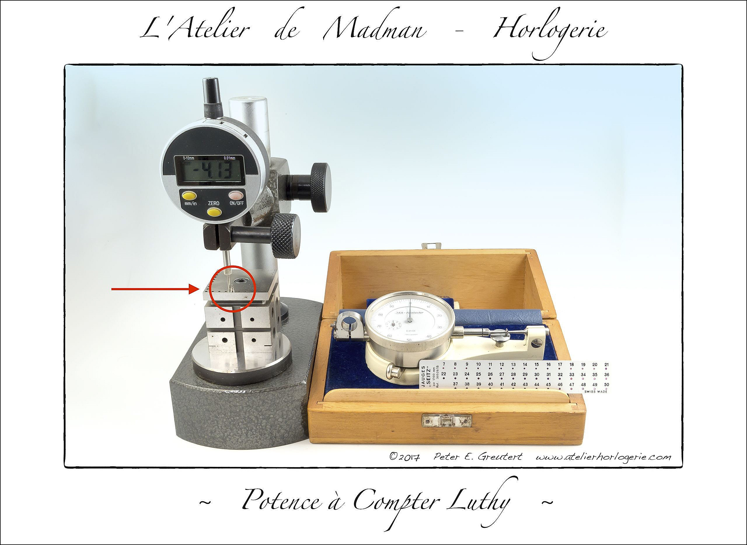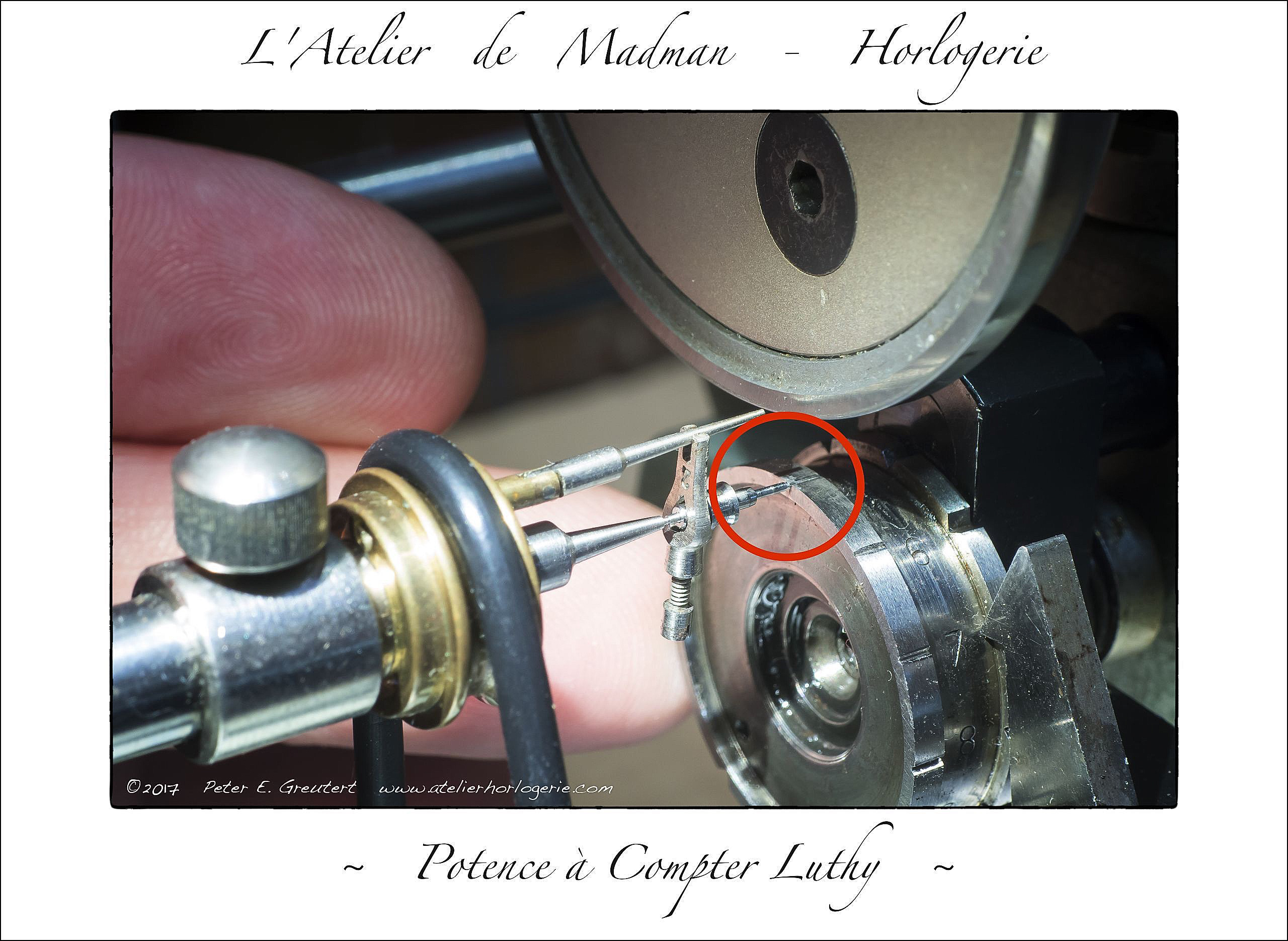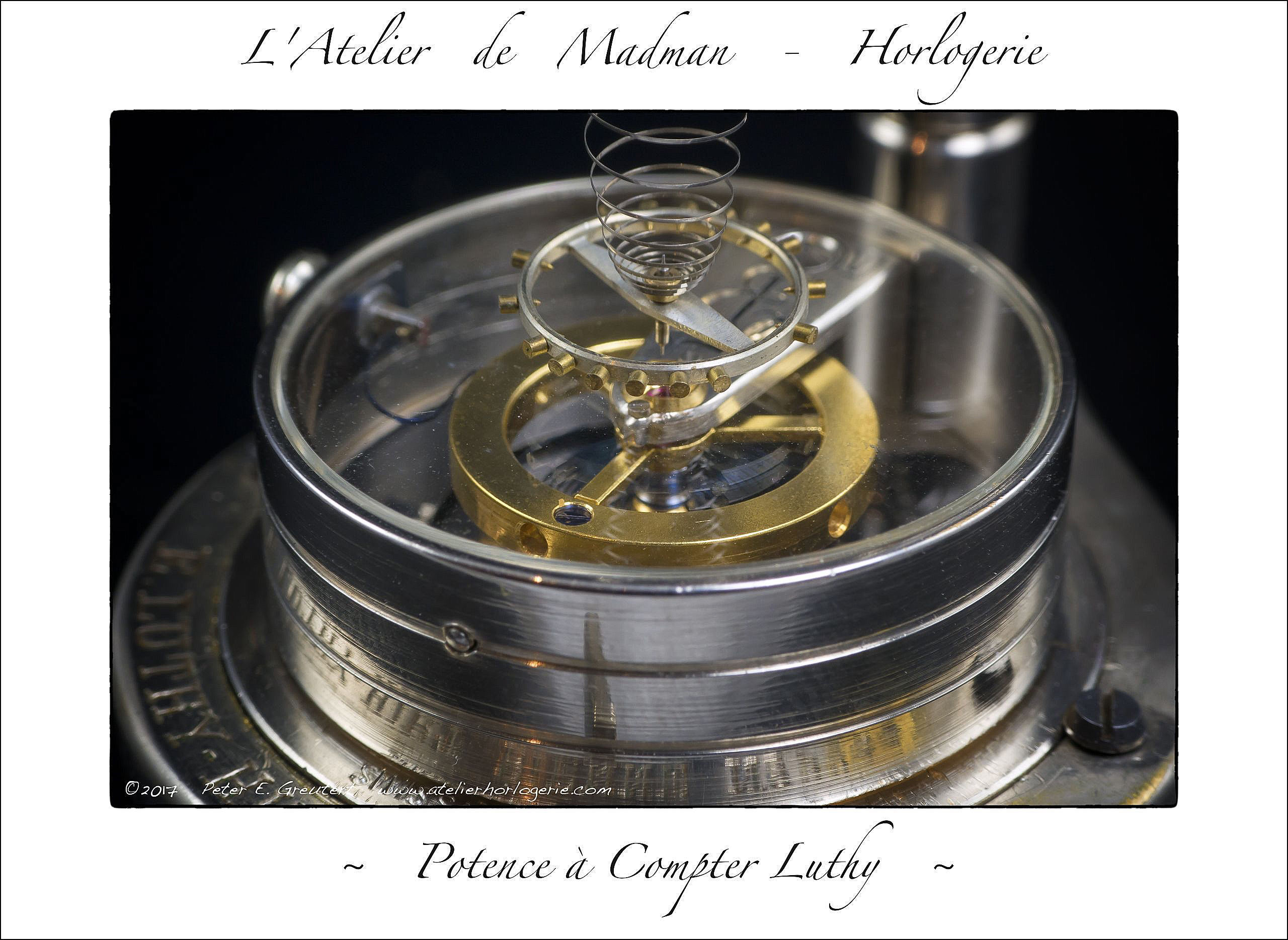 A quoi peut bien servir cet instrument ? Il est destiné à déterminer la longueur exacte d’un spiral pour qu’un ensemble balancier / spiral batte une fréquence bien déterminée. L’instrument et son lourd balancier servent d’étalon. L’ensemble à calibrer est fixé à la potence par sa pince. L’on met en rotation les deux balanciers et l’on observe si celui « à compter » est plus lent ou rapide que la référence : 18’000 alternances / heure. L’on ajustera la fréquence en déplaçant – à la pince brucelles – le spiral sur la pince de l’instrument. Spiral plus court = fréquence plus grande et inversement.