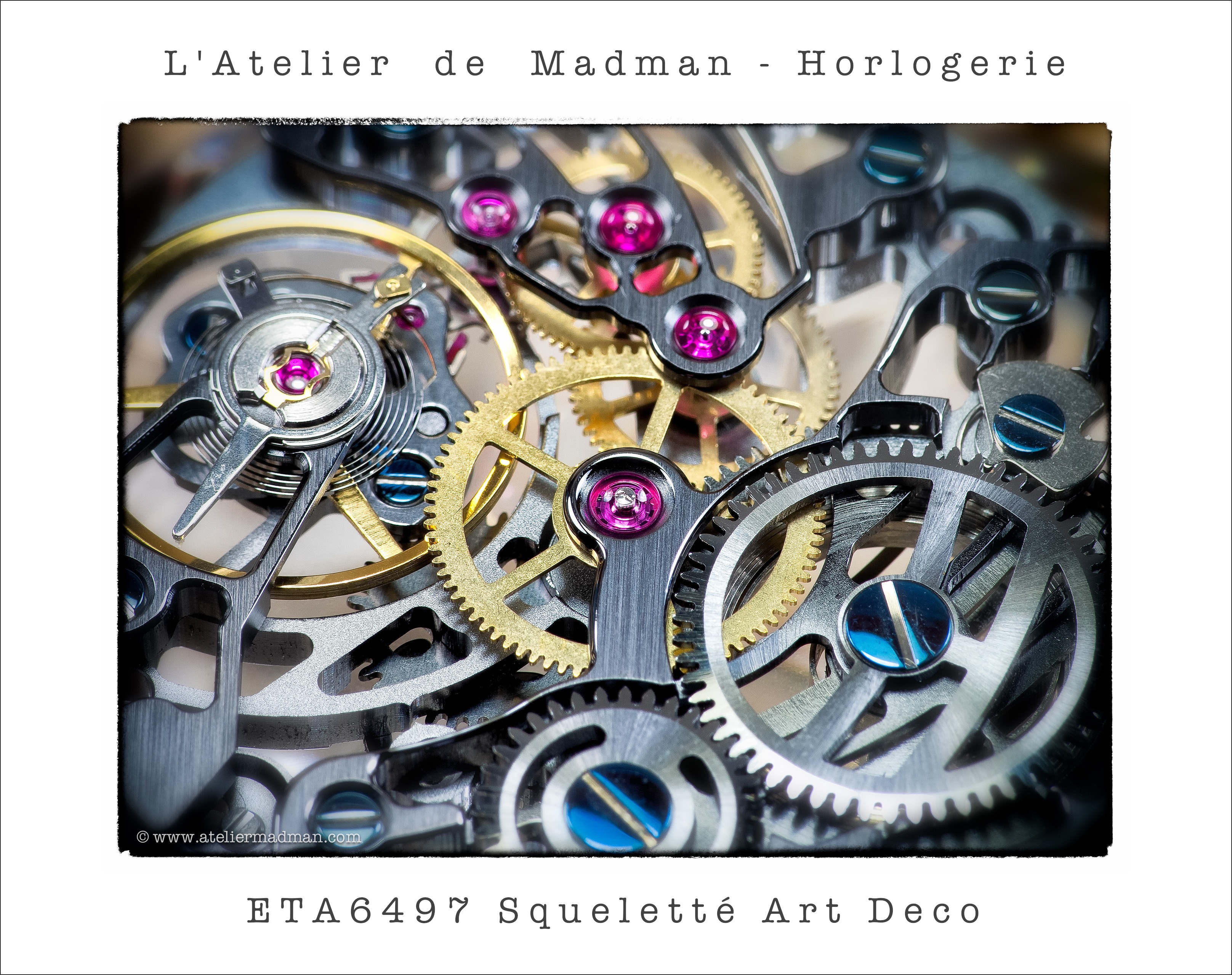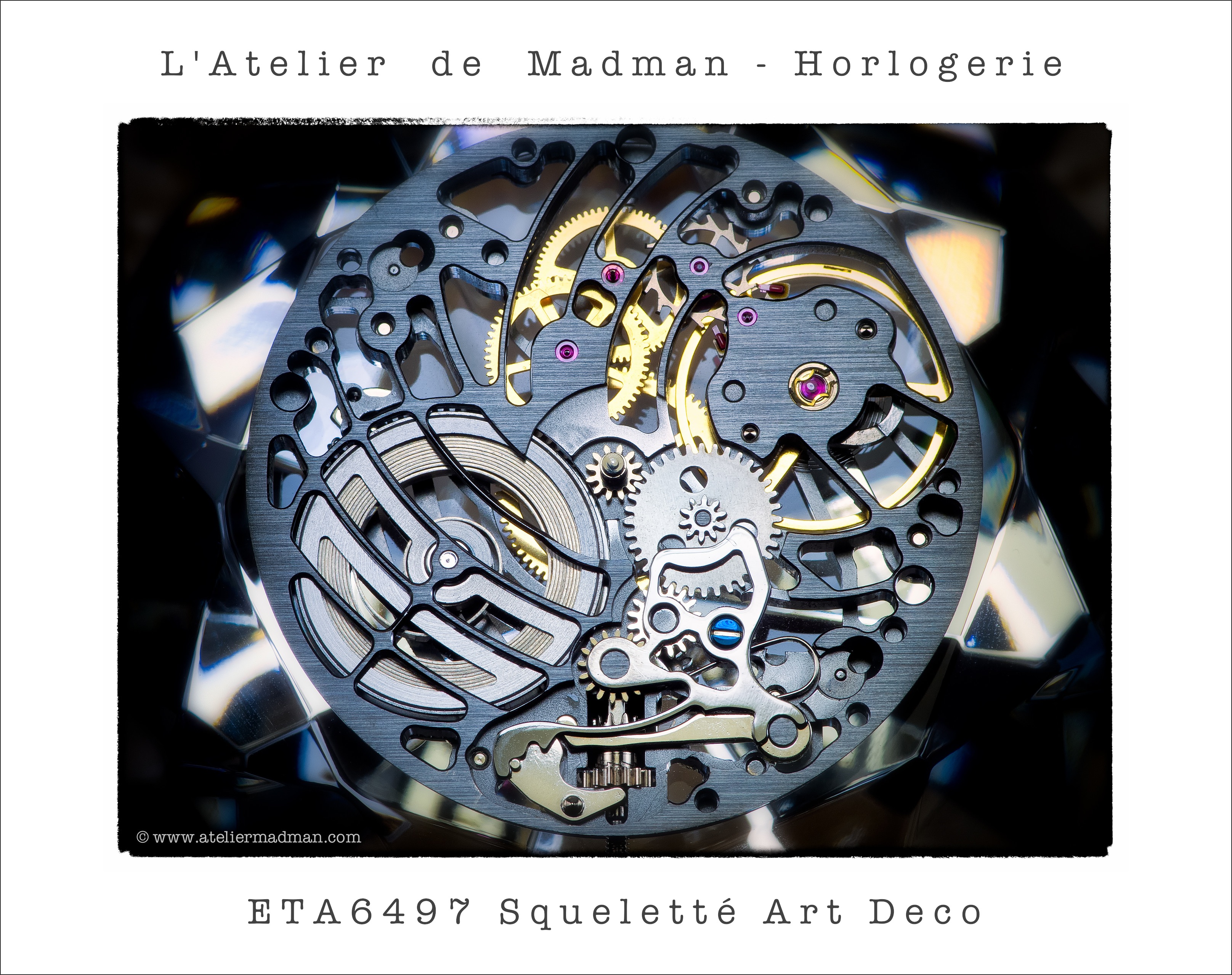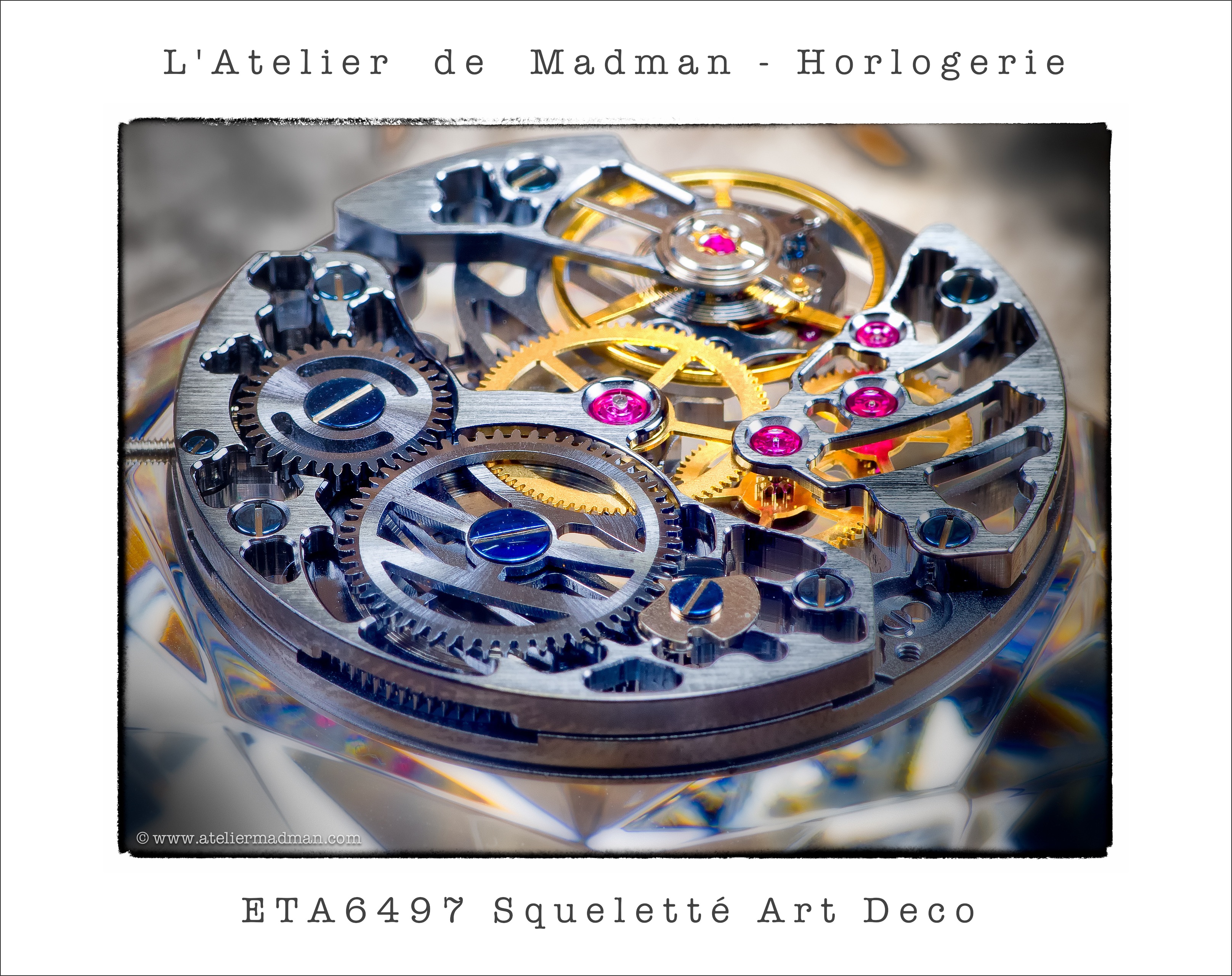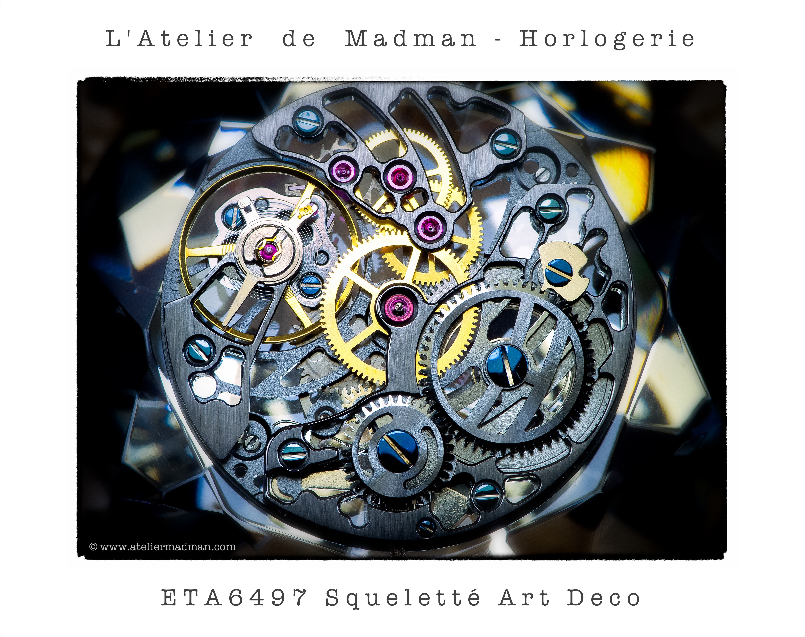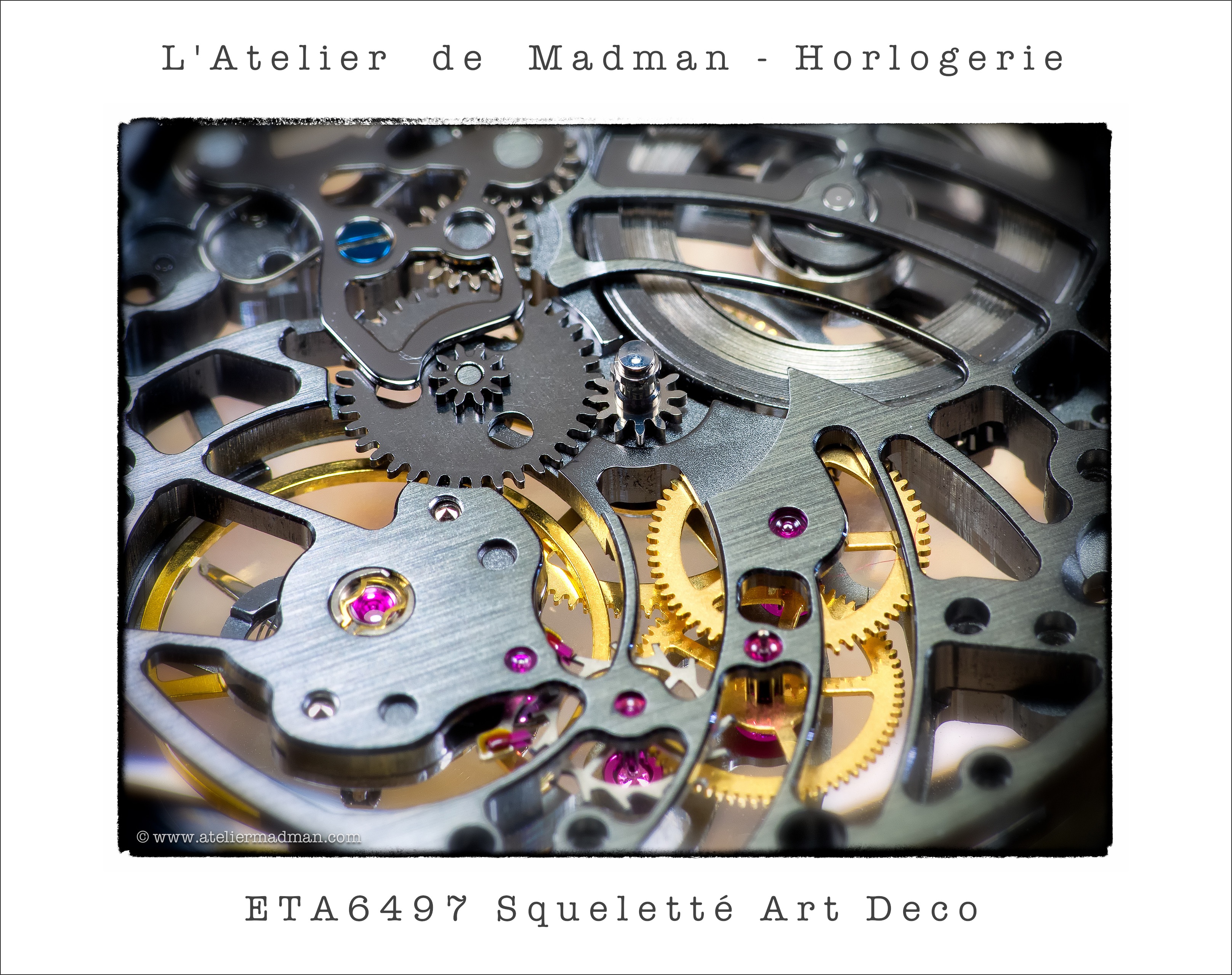 Enfin arrivé après plusieurs mois d’attente, ce mouvement Unitas 6497 est squeletté façon Art Deco et rhodié noir.