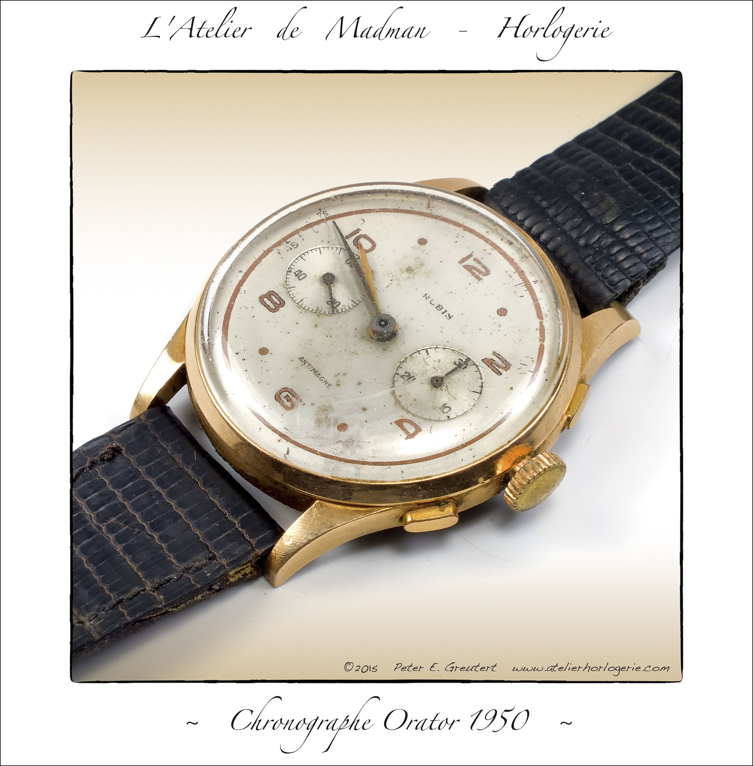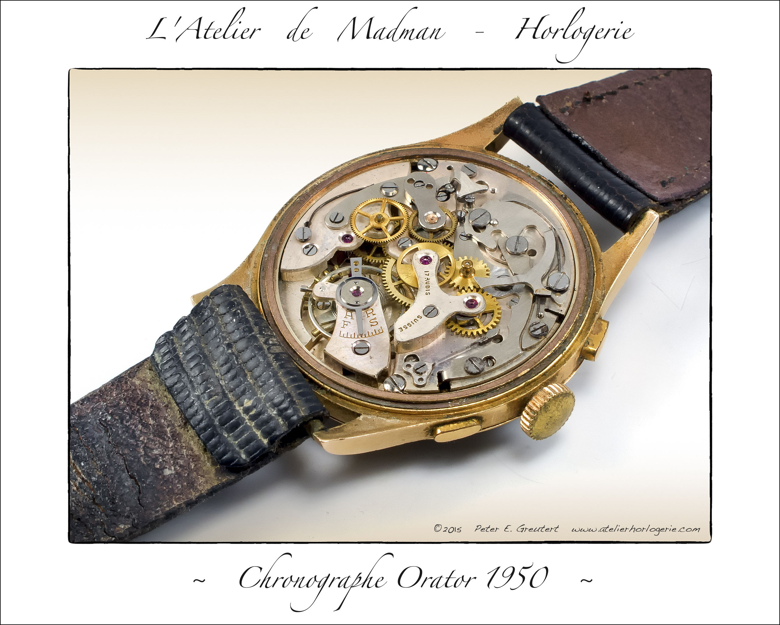 Sur le banc de l’Atelier, un nouveau projet de restauration : un Chronographe Orator des années 1940-50.