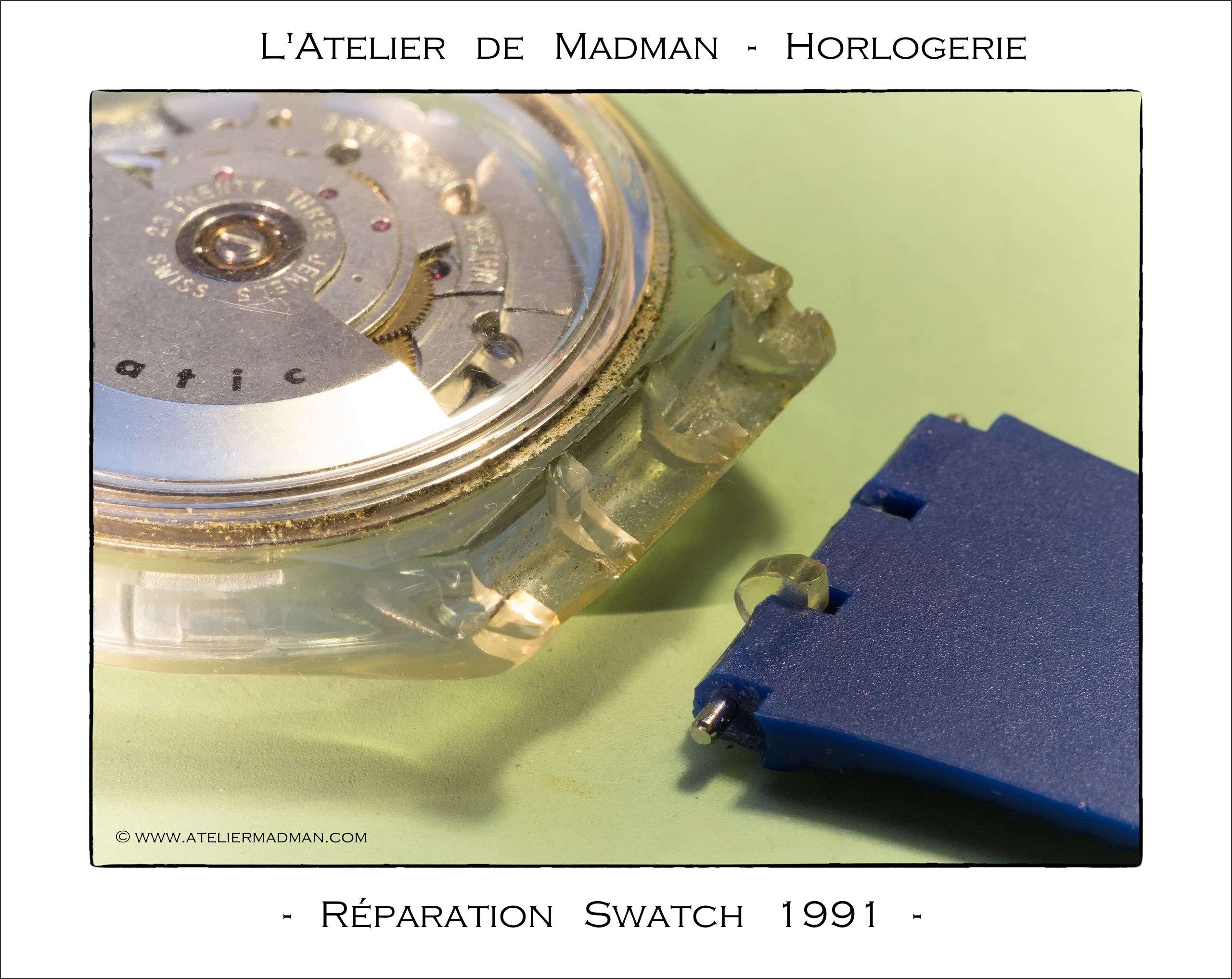 Un boîtier cassé, un bracelet qui ne tient plus : cette Swatch automatique de 1991 a besoin d’une réparation.
