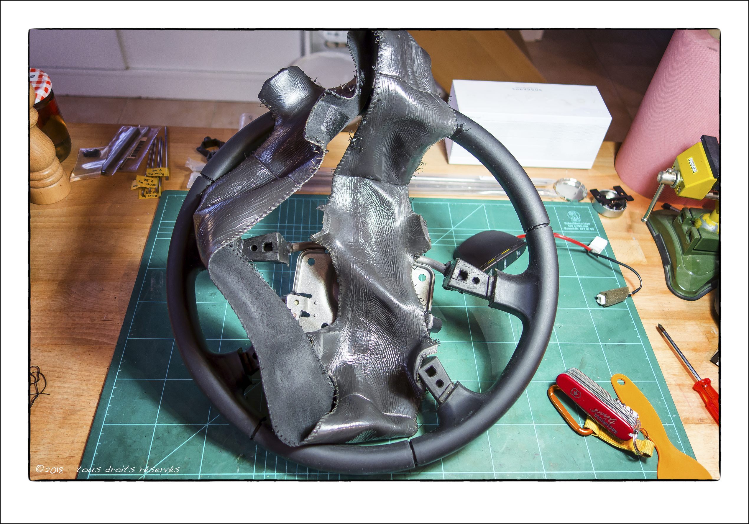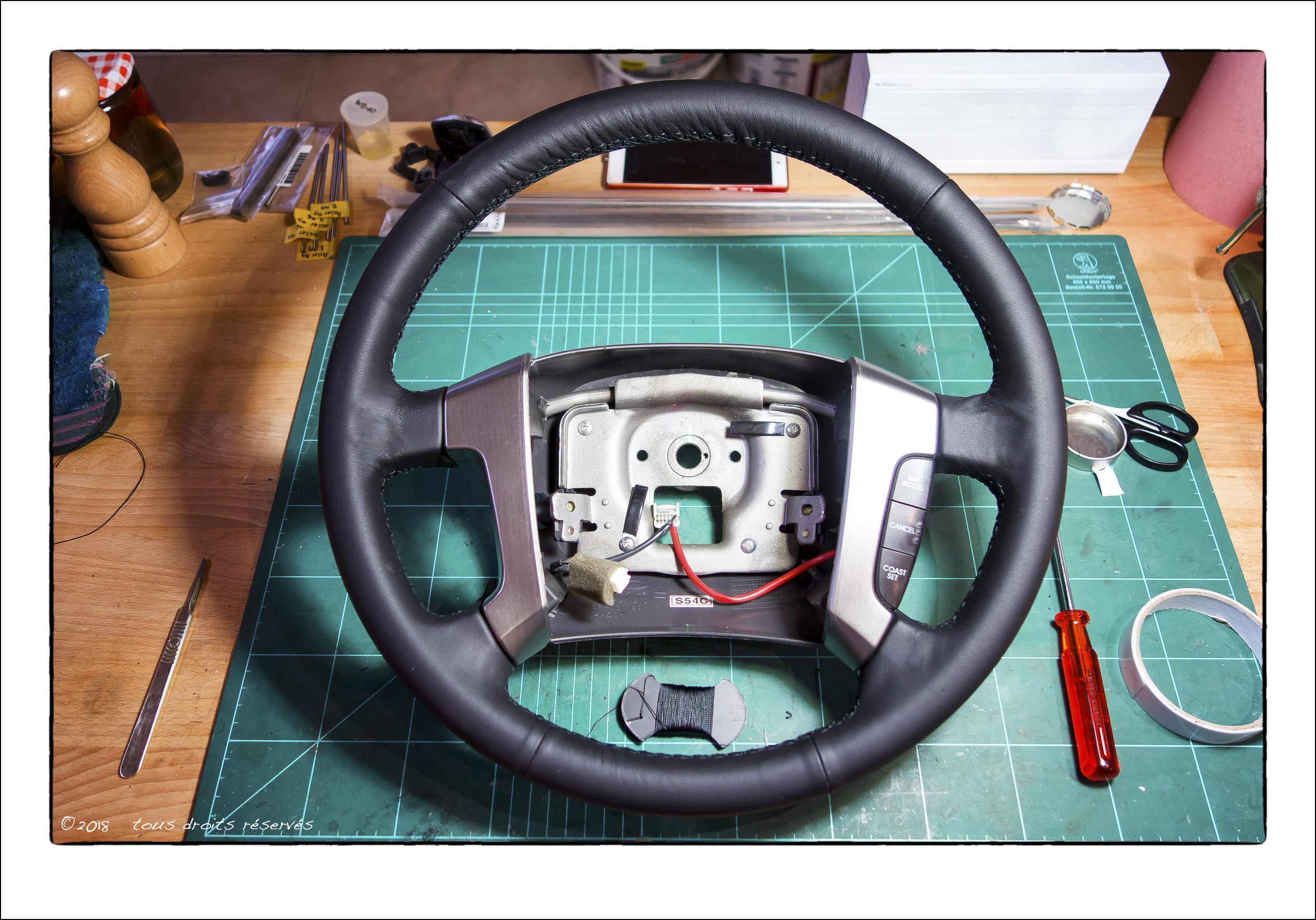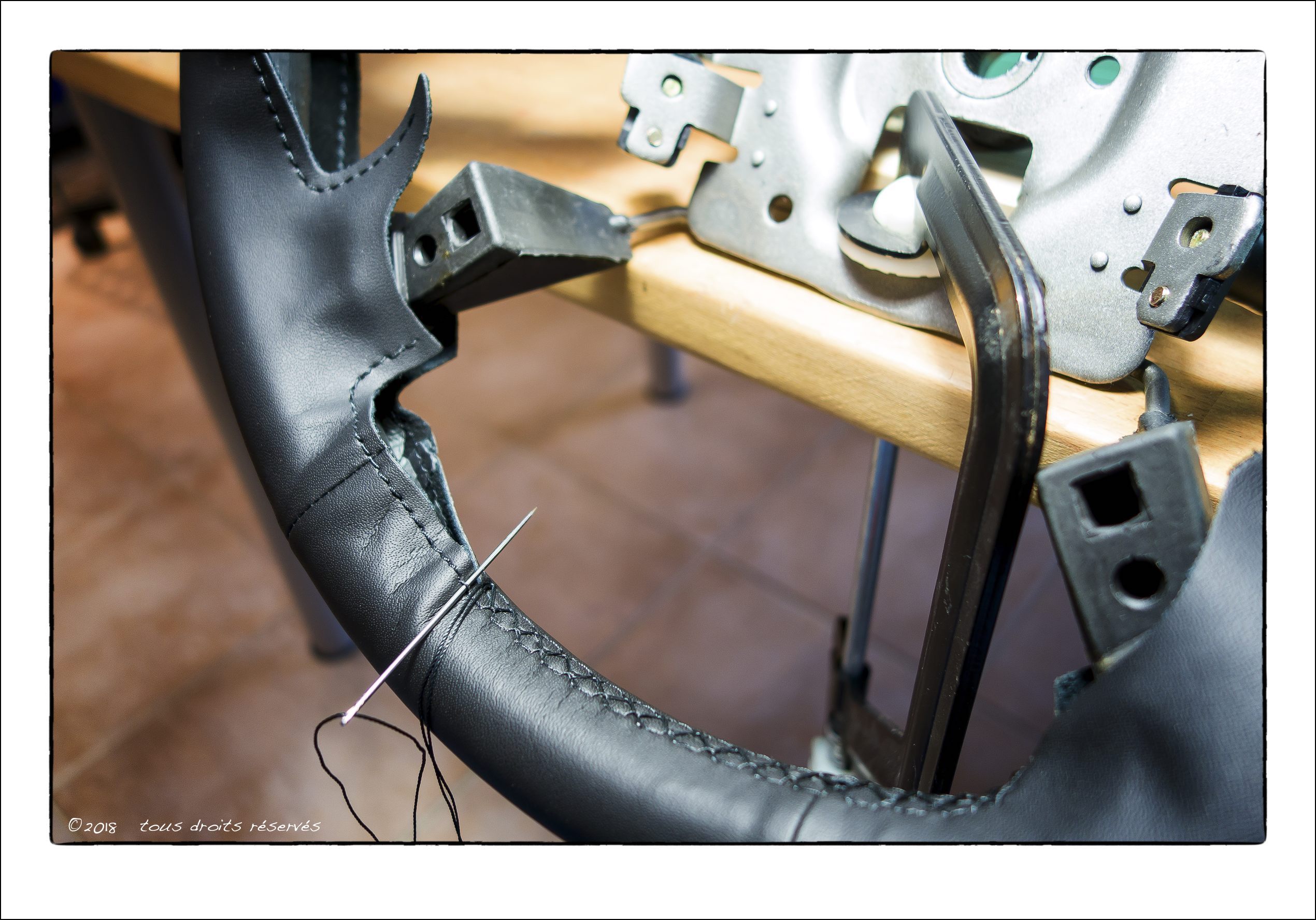 Remplacement de la gaine cuir du volant. Le revêtement synthétique d’origine était lissé par 245’000km de tours de volant.