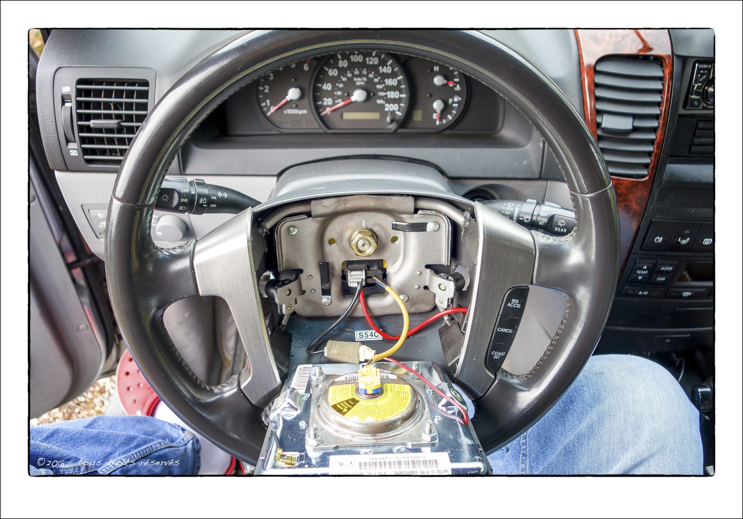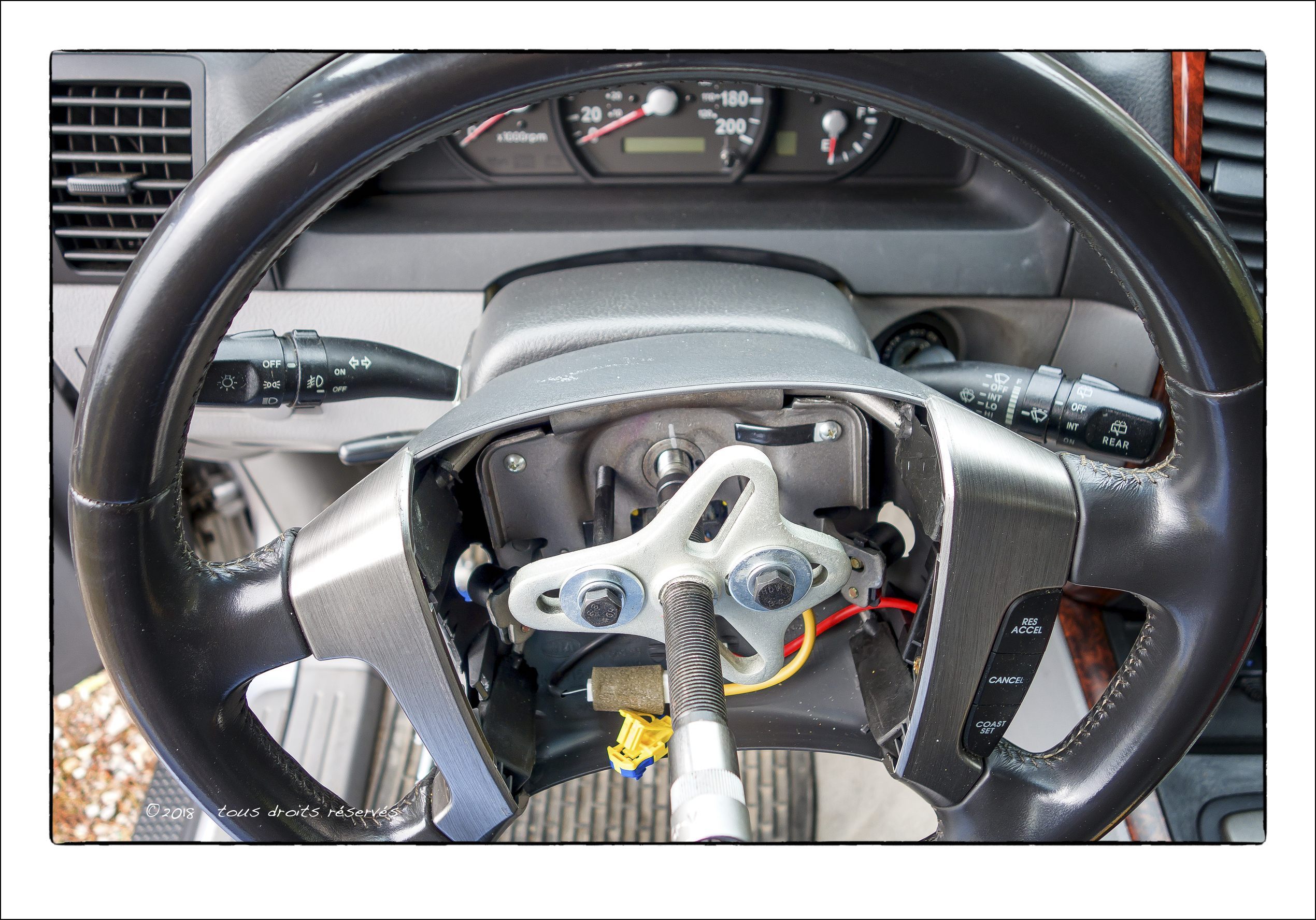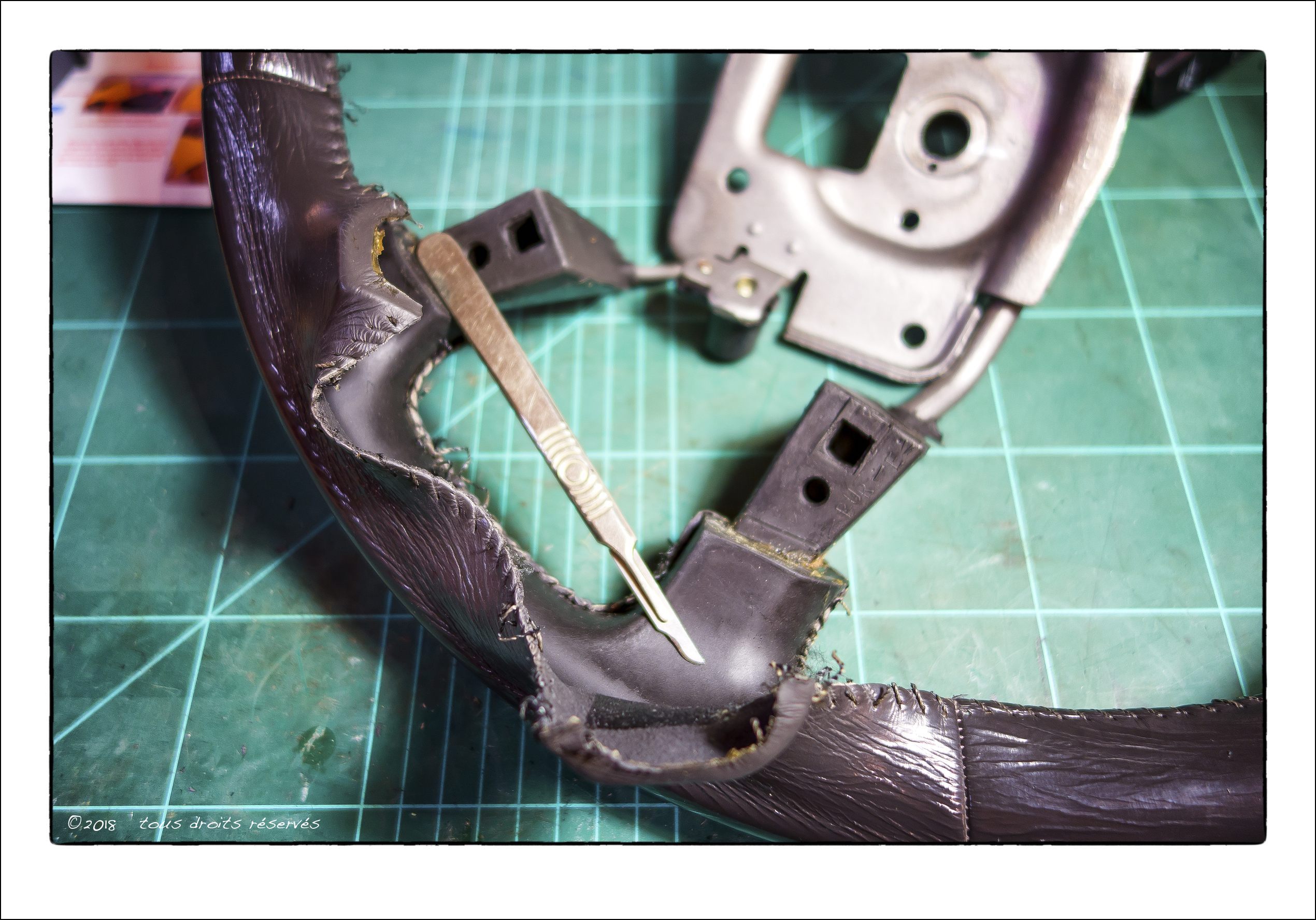 Remplacement de la gaine cuir du volant. Le revêtement synthétique d’origine était lissé par 245’000km de tours de volant.